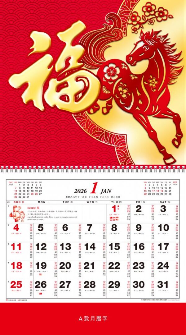 2026年 H88-5 高級花紙福曆 (駿馬迎福) (預 8月尾有貨, 請來電查詢)