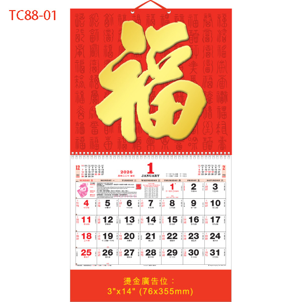 配燙金廣告雙色月曆肉 燙金廣告位: 3″ x 14″ (76x355mm)