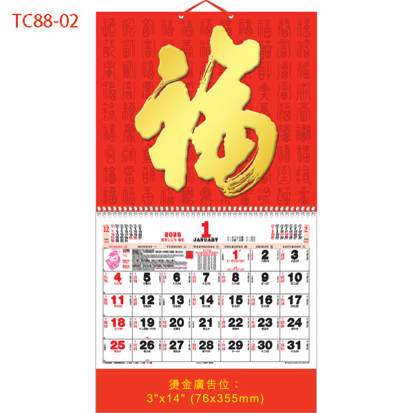 2026年 TC88-02 特大百福曆 (百福圖~草福) (預 8月尾有貨, 請來電查詢)