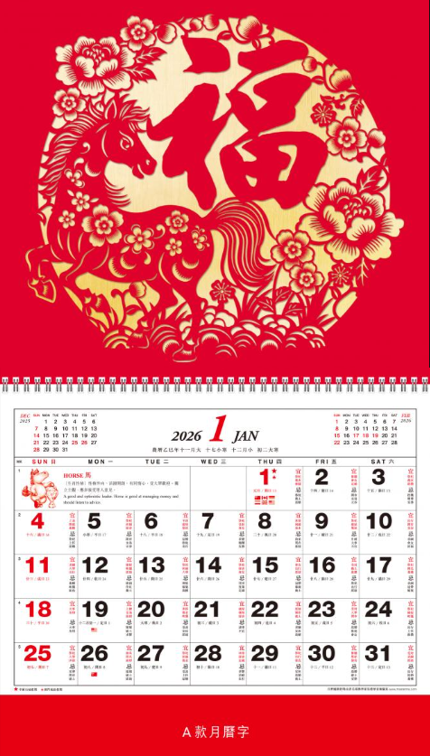 2026年 H88-23 高級花紙鐳射金咭福曆 (福到馬年) (預 8月尾有貨, 請來電查詢)